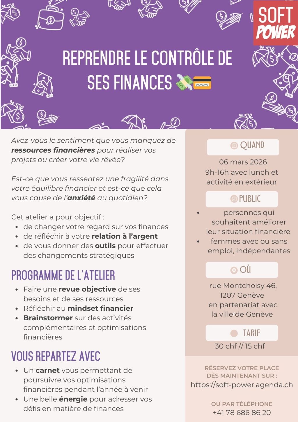 Avez-vous le sentiment que vous manquez de ressources financières pour réaliser vos projets ou créer votre vie rêvée? Est-ce que vous ressentez une fragilité dans votre équilibre financier et est-ce que cela vous cause de l’anxiété au quotidien? Cet atelier a pour objectif : C’est le 06 mars aux eaux-vives à Genève ou en ligne (nous préciser si…